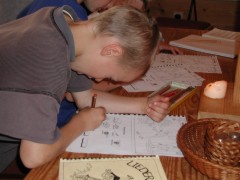 - Die Kinder beginnen ein Bild zu einer Szene aus der Geschichte ohne den anderen zu erzählen, was sie malen. Nach 5 Minuten wird das Bild nach rechts weitergegeben. Nun wird das Bild weiter gemalt. Nach 5 Minuten wiederholt sich der Vorgang. Am Ende werden die Ergebnisse gemeinsam betrachtet.